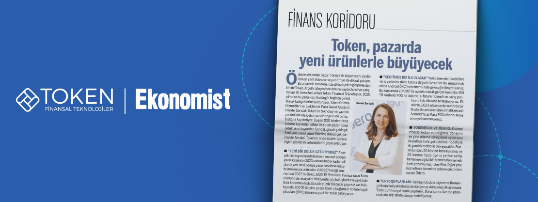 Ekonomide Türkiye, iş dünyası, girişim ve StartUp ekosistemi konularında sektörün nabzını tutan Ekonomist dergisi Ekim sayısında, Token Ödeme Hizmetleri ve E-Para Genel Müdürümüz Hande Sarıdal; Türkiye’de ödeme teknolojileri sektöründe 800 binden fazla fiziksel ödeme cihazıyla pazar liderliğimiz, yurt dışı planlarımız, hedeflerimiz ve dijital ödeme çözümlerimiz TokenFlex ve Ödero'dan bahsetti.